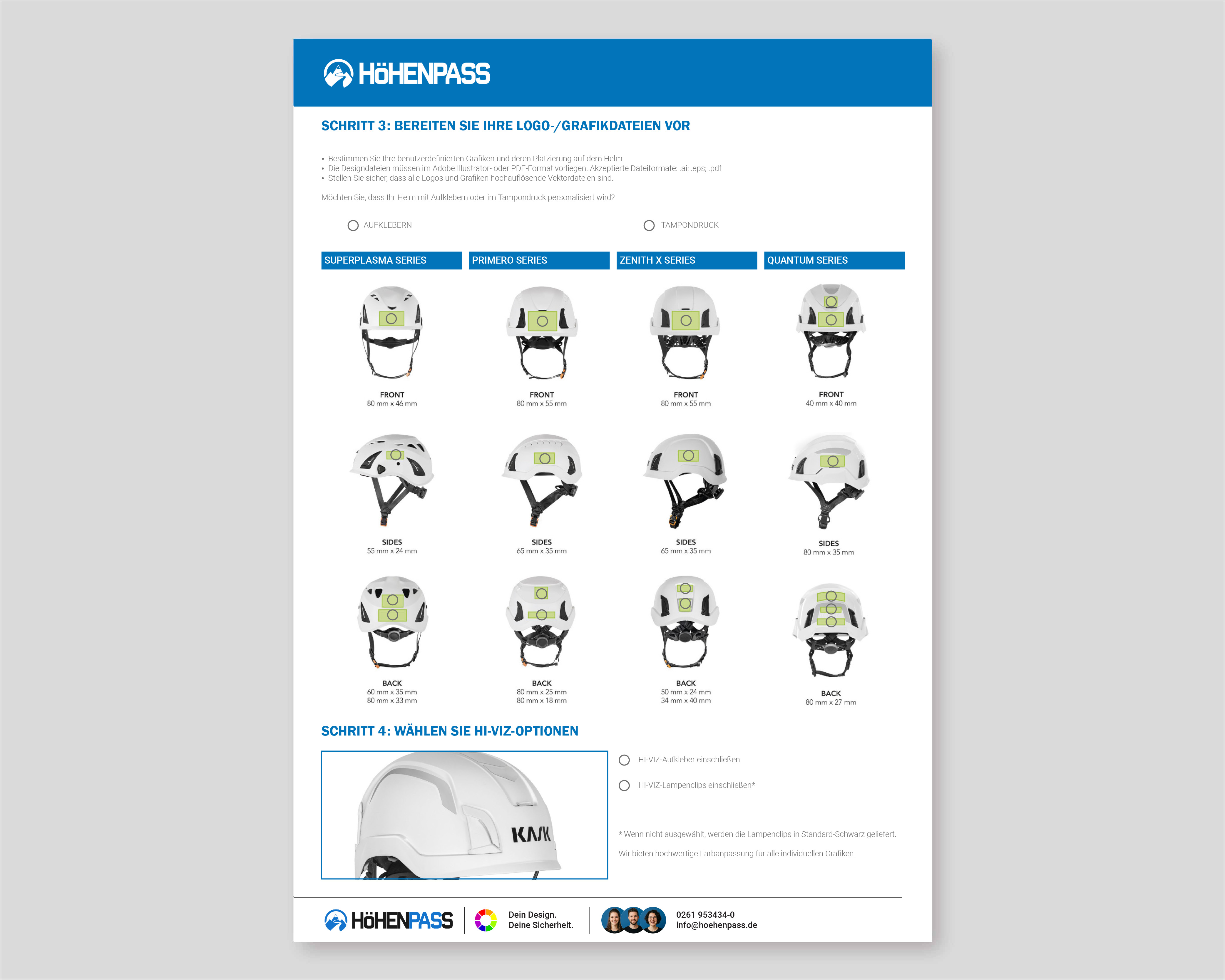 Konfigurieren Sie Ihren KASK-Helm ganz nach Ihren Vorstellungen: Wählen Sie Modell, Farbe und ergänzen Sie Ihr Logo oder individuelle Grafiken. Füllen Sie einfach das Formular aus – wir prüfen Ihre Angaben und erstellen Ihnen ein passendes Angebot.