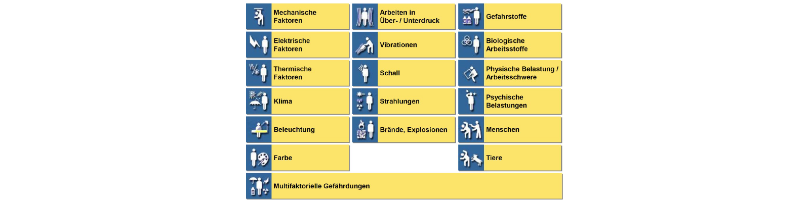 In einer Gefahrenquelle eines Arbeitssystems können mehrere Gefährdungsfaktoren wirken. So sind beispielsweise in der Gefahrenquelle „enger Raum im Innern des Pontons“ physische, psychische, klimatische und thermische Faktoren sowie die Faktoren Licht und Farbe relevant.