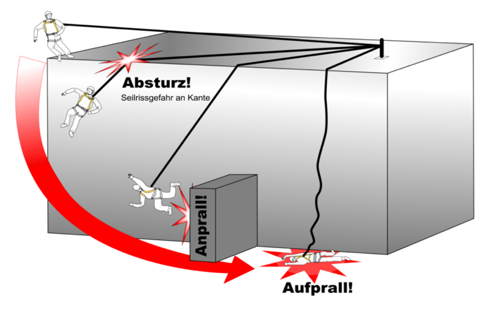 Ein Pendelsturz kann auftreten, wenn die Positionierung des verwendeten Anschlagpunktes nicht korrekt ist. Ein Pendelsturz tritt auf, wenn sich der Anwender bei einem Absturz nicht unmittelbar unter dem Anschlagpunkt oder in unmittelbarer Nähe zum Anschlagpunkt befindet, sondern versetzt dazu. Ein typisches Szenario ist beispielsweise, wenn sich der Anwender entlang einer geraden Absturzkante an einem einzelnen Anschlagpunkt sichert.